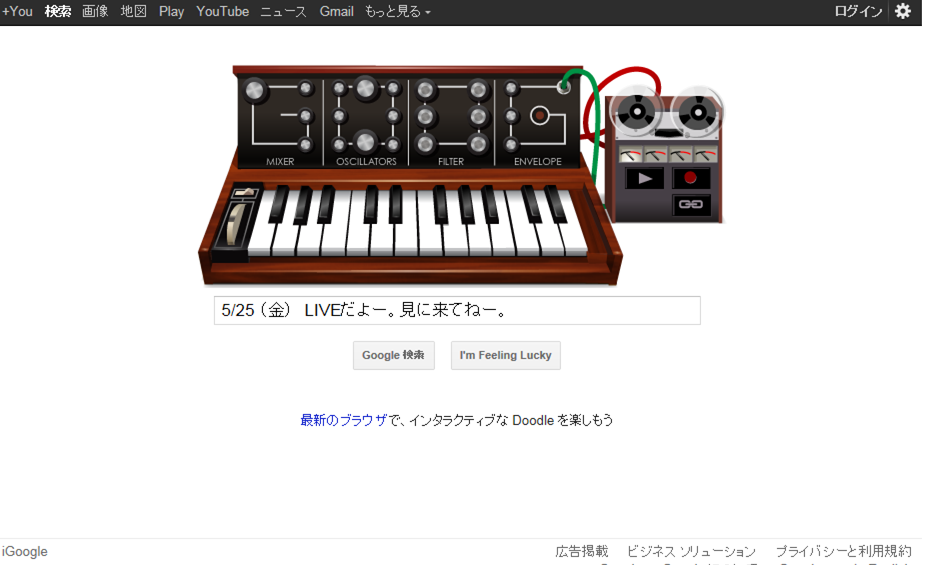 いよの親知らズいとうようこの日々をつづります。PAGE | 379 378 377 376 375 374 373 372 371 370 369 | ADMIN | WRITE 2012.05.23 Wed 10:05:55 きょうのGoogleステキなのよー。 ロバート・モーグ生誕78周年だって。 この方がいなければ、今の音楽はないと言っても過言じゃございません。 今日いろんなことを、ググってみるときは(笑 このトップページも楽しんで!!! PR CommentsComment Form |